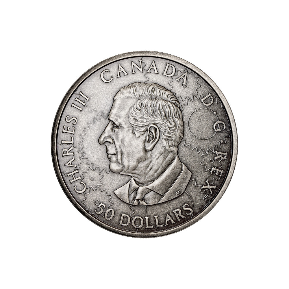 The coin is made of 3 ounces of 99.99% pure silver and is part of a limited edition of 2,500 coins worldwide. The serrated edge enhances the industrial look, and the antique finish gives the coin a subtle patina that accentuates the look of old metal and machinery. Numerous engraved details such as gears appear on the reverse and obverse, creating an attractive steampunk motif.