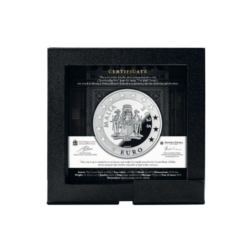 This exclusive 1Oz silver coin is the second release in the "City Hall Clocks" series and ticks to the rhythm of London. Big Ben. Sublime. Unwavering. Cutting through the misty air above the Thames. Every quarter of an hour, "Westminster Quarters" chimes. Eyes raised as footsteps echo off the cobbles. Breathe in the cool air. Hearts captivated by the sound wave. Still stretched by hand. A relentless survivor of the fury of World War II. Proof of endurance cast in Proof perfection. The coin is sealed in a case with a certificate of authenticity. Only 700 pieces in the world.