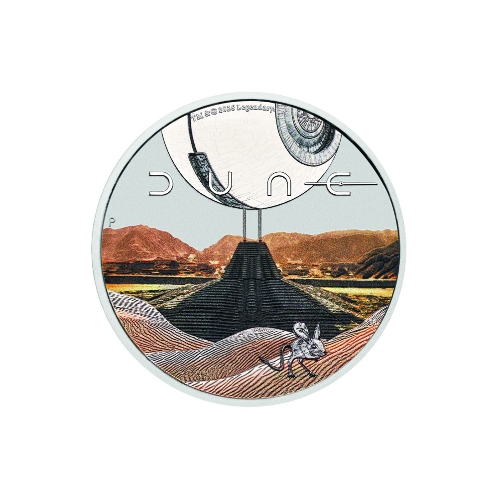 designed by Sean Rogers, features a colourful scene from the planet Arrakis. In the background is the monumental ship of the Emperor and the Imperial tent against a backdrop of vast deserts. In the foreground is the desert mouse Muad'Dib, a symbol of the adaptability and spiritual strength of the Fremen people. The composition also includes the Dune logo and the 'P' mintmark.