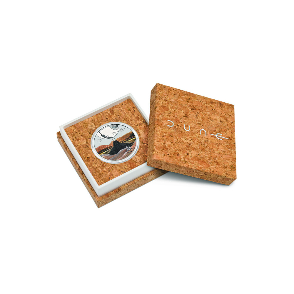 The coin is minted in 99.99% pure silver, weighs 1 oz (31.107 g) and has a diameter of 40.90 mm. The 2026 issue has a face value of 1 TVD and is limited to a maximum mintage of 3,000. The coin comes with a numbered certificate of authenticity and is housed in an FSC-certified cork case bearing the Dune logo and themed outer packaging. This is an offering for collectors and fans of this universe.