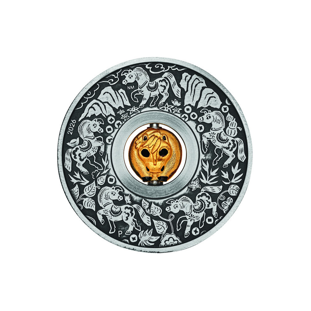 The reverse of the coin depicts a rotating gold-plated silver bead in the shape of a horse. It is surrounded by five horses in different positions, depicted in the style of Chinese paper-cutting, set in stylised foliage. Also included is a Perth Mint "P" mintmark and the year of issue 2026.
