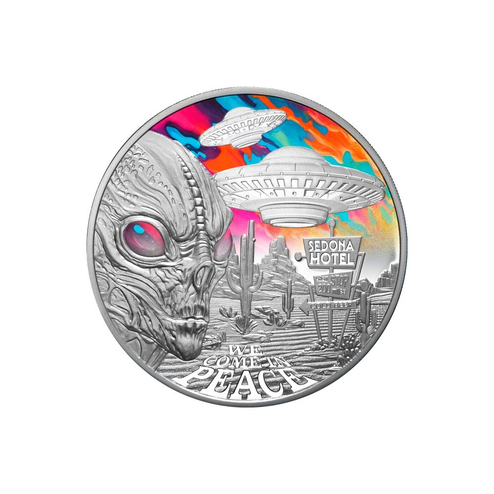 Ne tikai šīs monētas iespaidīgā monētas kalšanas kvalitāte liks jums aizrautīgi pukstēt sirdij - tās aizmugurējā puse ļaus jums ieskatīties brīnumaini detalizētā citplanētieša dvēselē no NLO karstā punkta Sedonā, Arizonas štatā! Sedona ir slavena ar savu nelīdzeno ainavu, dramatiskajiem sarkano klinšu veidojumiem un reputāciju kā magnēts citplanētiešu aktivitātēm! Sedonas ēteriskā tuksneša ainava, kas stiepjas tālumā, ir apzīmogota no 1 unces tīra 99,9 % SUDRABA, papildināta ar sarežģītām un aizraujošām detaļām, kas attēlam piešķir tuksneša skaistuma un noslēpumainības sajūtu. Šo monētu no citām atšķir drosmīgās neona krāsas, kas atainotas digitālā krāsā un biedējoši atspoguļojas citplanētieša acīs, piešķirot šai sudraba monētai vēsu retro stilu, kas ir unikāls un neatvairāms!