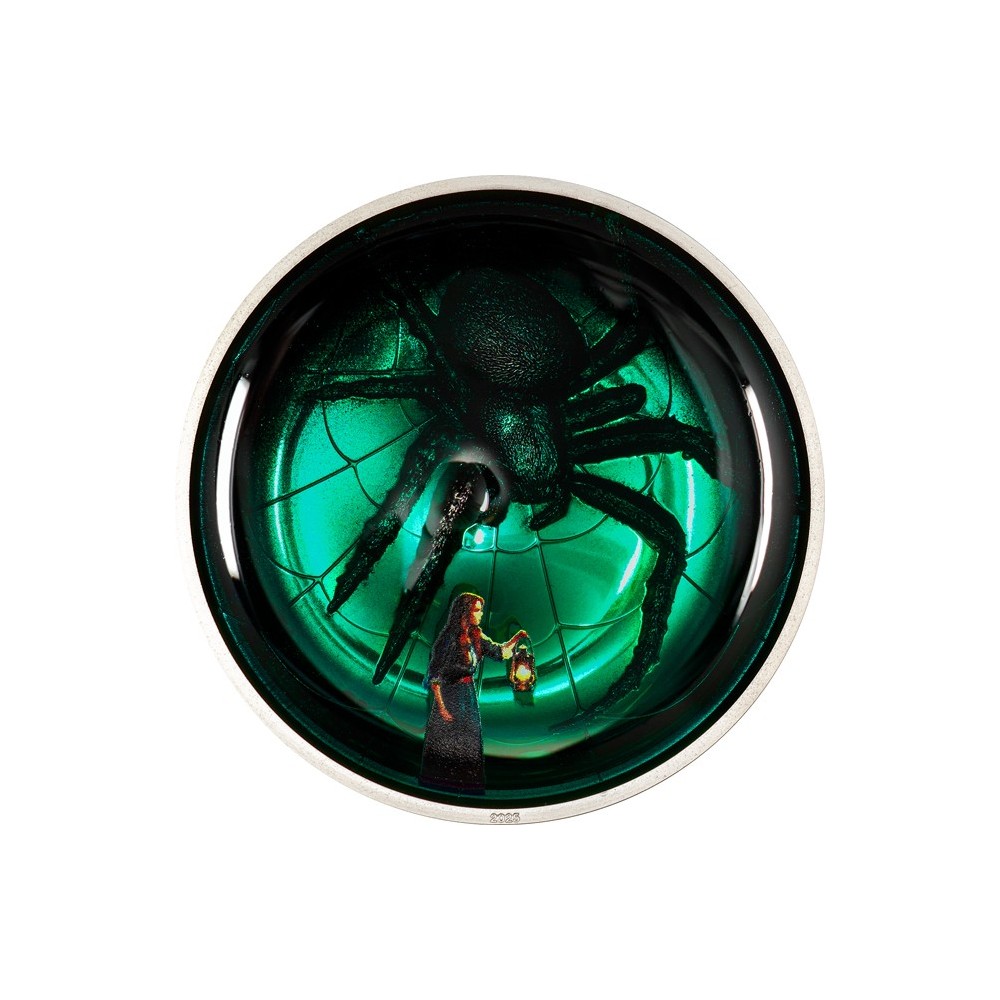 Šī baismīgā 2 unču sudraba monēta, kas ir daļa no sērijas "Fobija", atspoguļo baiļu būtību ar savu satriecošo dizainu un pārsteidzošo krāsojumu, kas rada ilūziju par upuri, kurš ir iesprostots briesmīga zirnekļa gūstā. Šai sudraba monētai ir grezna proof kvalitāte, un tā ir iesaiņota futrālī kopā ar autentiskuma sertifikātu. Ierobežota tirāža - tikai 999 eksemplāri visā pasaulē!