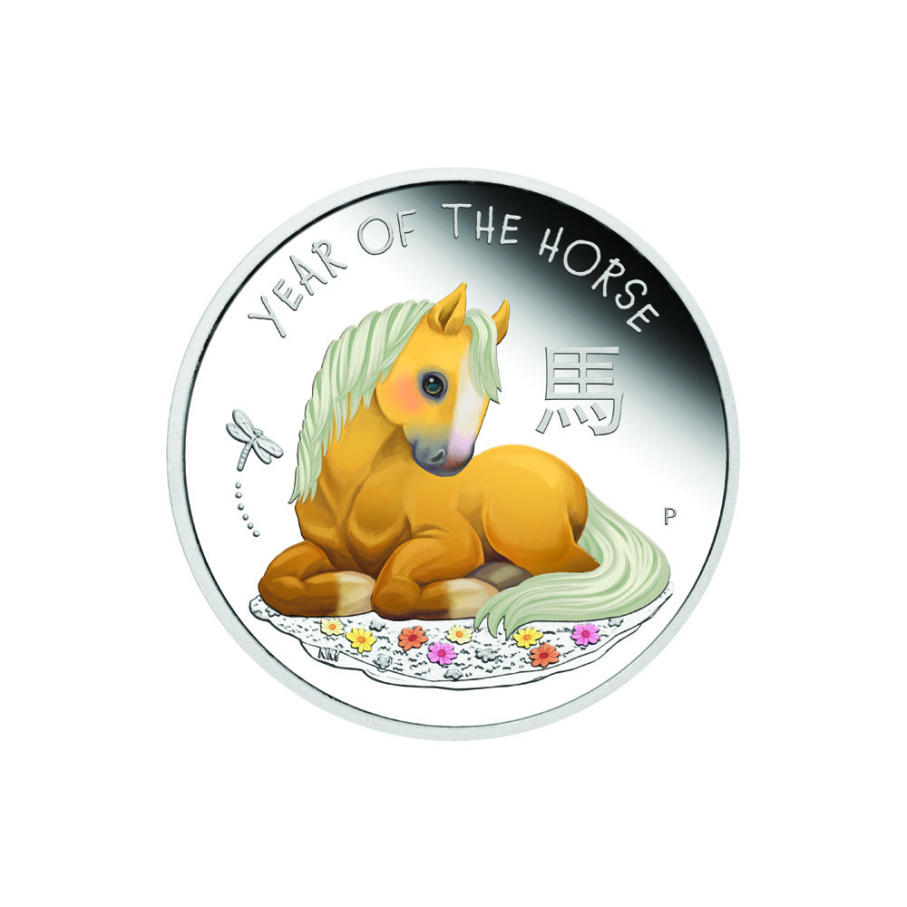 Monētas reversā attēlots krāsains motīvs, kurā laimīgs kumeļš atpūšas uz zālienes, rotātas ar maigiem ziediem, un virs tā lido pūce. Monētas dizainā ir arī ķīniešu valodas burts, kas apzīmē zirgu, uzraksts "ZIRGA GADS" un Pērtas monētu kaltuves "P" kaltuves zīme.