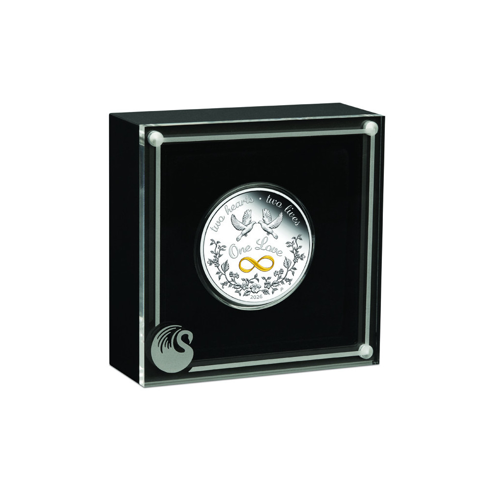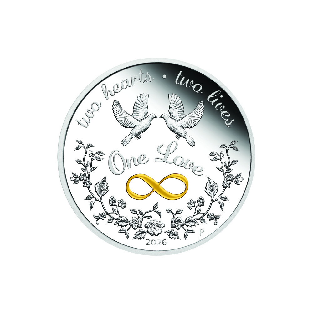 Monētas reversā ir divi baloži un krāsains bezgalības simbols, kā arī uzraksti "ONE LOVE", "TWO HEARTS", "TWO LIVES" un kalšanas gads - 2026. gads.