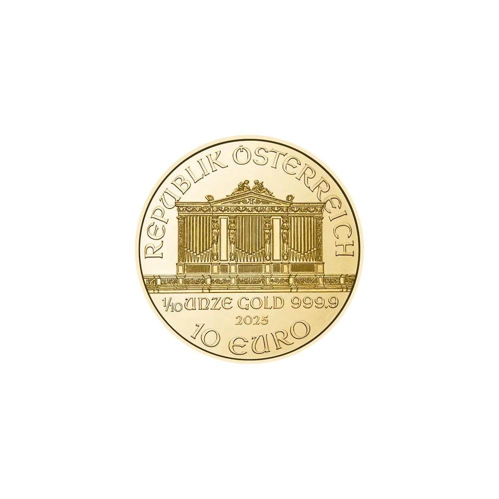 Par savu nosaukumu Vīnes filharmoniķi ir pateicīgi slavenajam Austrijas orķestrim, kas ir viens no labākajiem pasaulē. Zelta monētas priekšpusē attēlotas Vīnes Mūzikas nama lielās ērģeles. Zem ērģelēm ir uzspiests 1/10 unces svars, 999,9 proves pakāpe, kalšanas gads un nominālvērtība 10 EURO. Virs tās ir uzraksts "REPUPLIK ÖSTERREICH". Monētas reversā attēlots kāds no filharmonijas orķestra mūzikas instrumentiem, bet augšējā malā redzams orķestra nosaukums un zelta monētas uzraksts "WIENER PHILHAMRONIKER". Līdzīgi kā iepriekš minētās zelta monētas, arī Vīnes filharmoniķi ir pieejami 1 unces, 1/2 unces, 1/4 unces un 1/25 unces monētas.